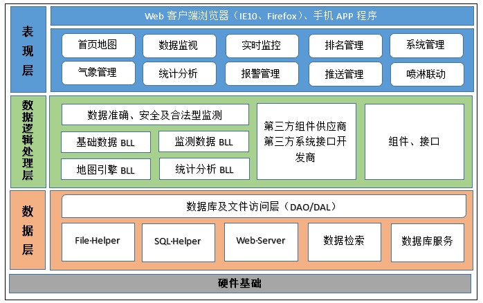 系統的主要功能模塊包括:電子地圖、實時監控、數據查詢、報警管理、站點排名、統計分析、網絡監控、噴淋聯動、系統管理、運維管理。