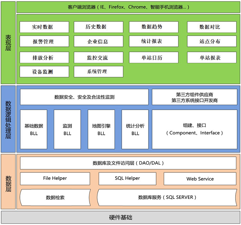 平臺的主要功能模塊包括:實時數據、歷史數據、數據趨勢、數據質量、站點分布、統(tǒng)計報表、單站報表、數據通比、單站日歷、排放分析、報警管理、企業(yè)信息、監(jiān)控交流和系統(tǒng)管理等。