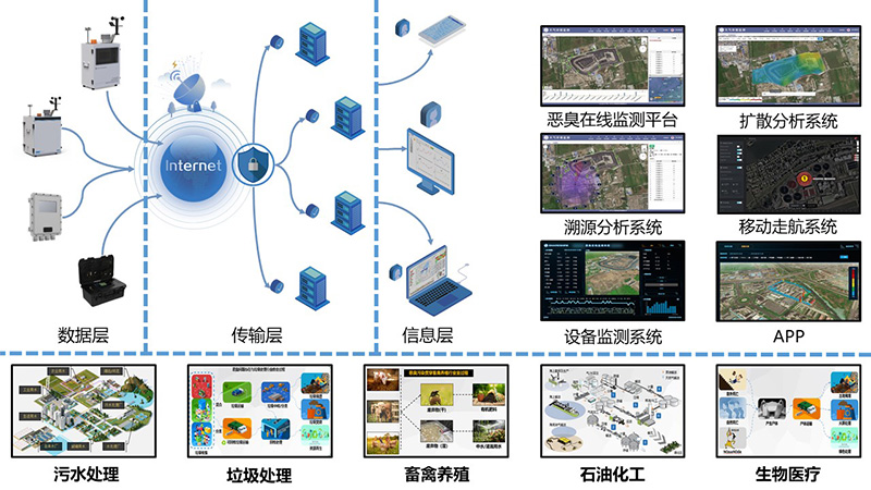 通過安裝惡臭在線監測系統,可以實時在線監測環境空氣,掌握污染物特征,建立預警管理系統,追溯污染排放源,制定減排方案。系統可廣泛應用于化工園區、垃圾填埋場、污水處理廠、石油煉化、食品生產廠家、生物醫藥生產廠家、畜牧養殖廠、醫院等場合。