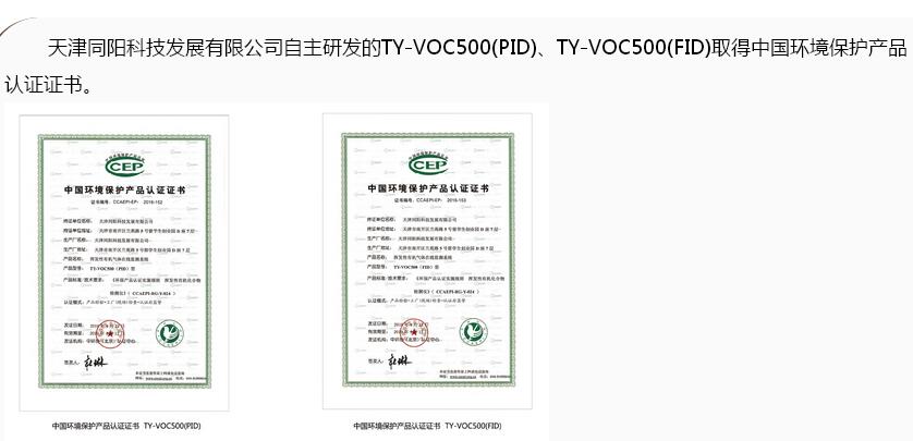 同陽TY-VOC500(PID/FID)在線監測系統取得中國環境保護產品認證