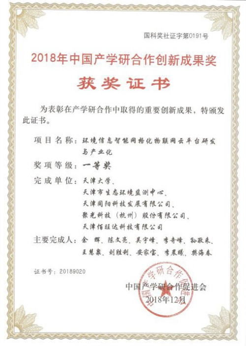 “環境信息智能網格化物聯網云平臺研發與產業化”項目是由天津同陽科技發展有限公司聯合天津大學、天津市生態環境監測中心、聚光科技(杭州)股份有限公司、天津佰旺達科技有限公司共同申報,歷經數年持續攻關,取得多項創新性成果,并應用于十余個省市的環境監測重點項目,為防污減霾作出重大貢獻,具有顯著的經濟效益和社會生態效益。