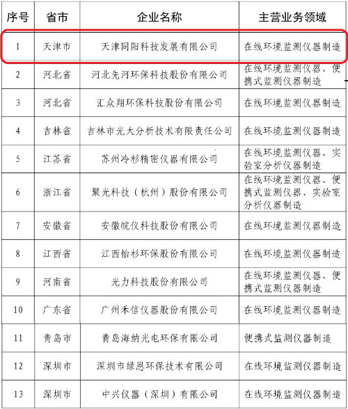 更新時間: 點擊:13906 所屬欄目:公司新聞 Update Time: Hits:13906 Belong Column:News日前,工業和信息化部發布符合《環保裝備制造業(污水治理)規范條件》及《環保裝備制造業(環境監測儀器)規范條件》的企業名單(第一批)公示的通知。由公示內容可知,符合《環保裝備制造業(環境監測儀器)規范條件》企業公示名單(第一批)共計13家,天津同陽科技發展有限公司榜上有名。