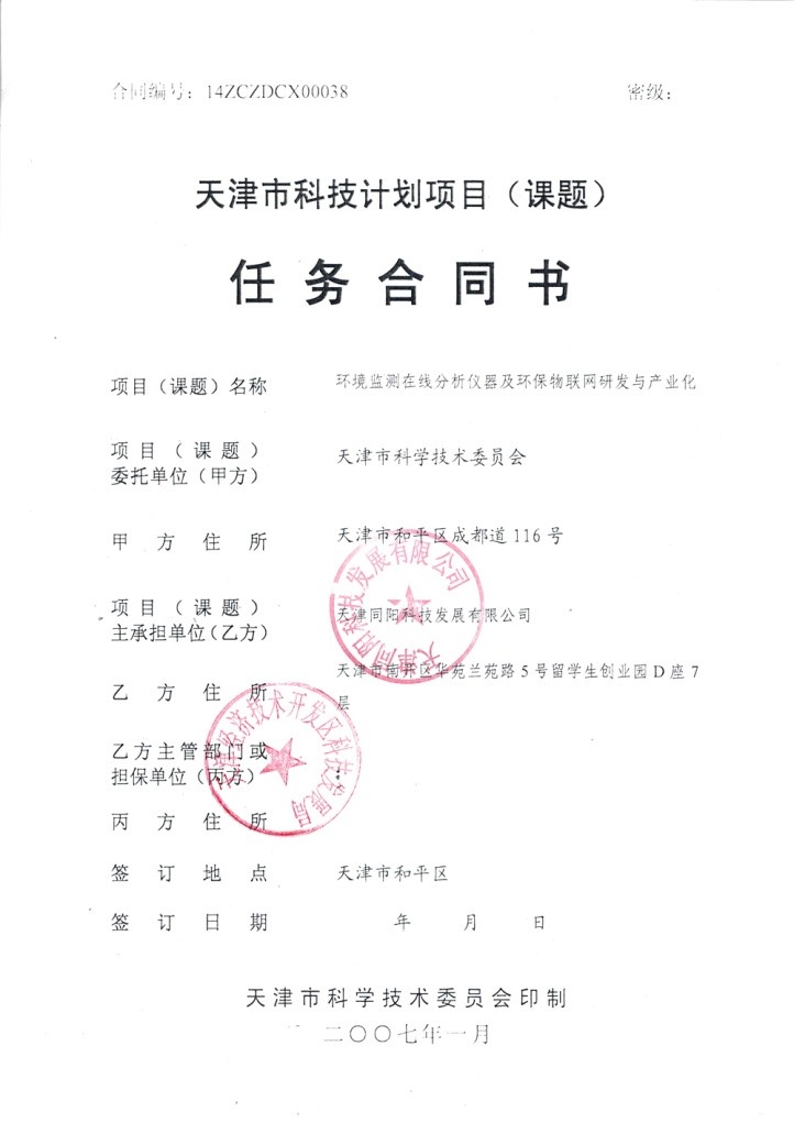 同陽科技獲得“2014年天津市科技支撐計劃重點項目”立項支持 更新時間:2014-11-21 點擊:23419 所屬欄目:公司新聞 Update Time:2014-11-21 Hits:23419 Belong Column:News 2014年11月19日,由天津同陽科技發展有限公司牽頭的“環境監測在線分析儀器及環保物聯網研發與產業化”項目,經天津市科學技術委員會批準列入“2014年天津市科技支撐計劃重點項目”,在“資源環境”領域獲得立項支持。