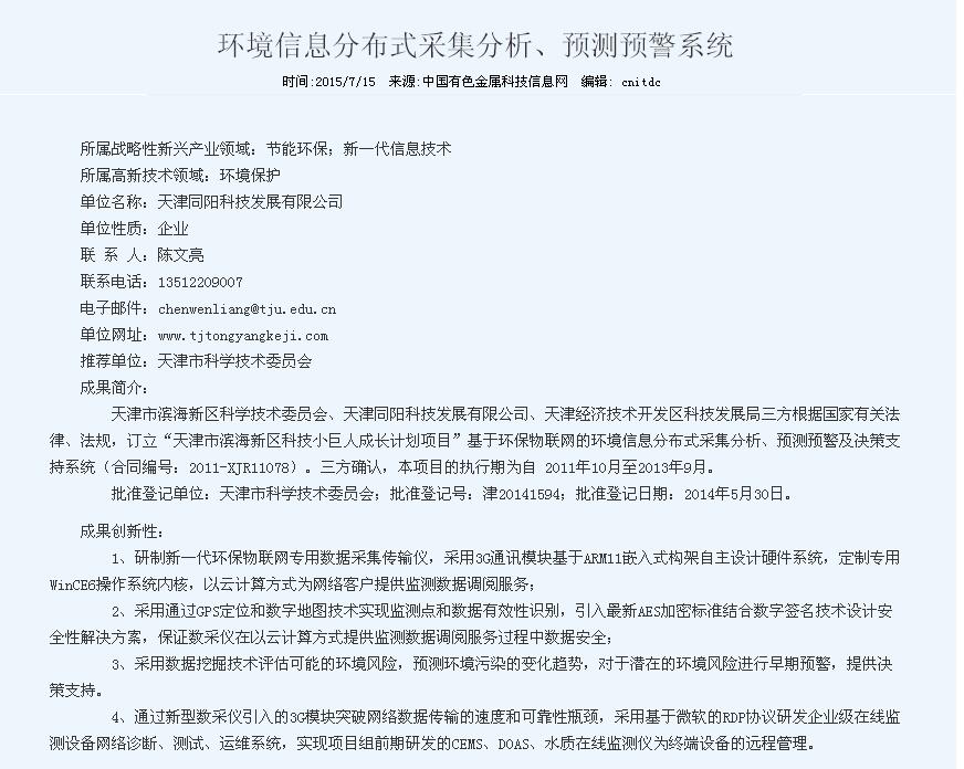 天津同陽科技申報的“環境信息分布式采集分析、預測預警系統”項目,獲得天津市濱海新區科學技術進步三等獎。