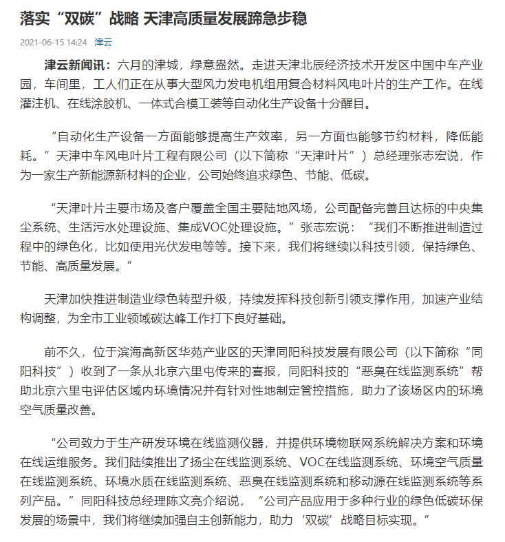 近日,津云新聞以“落實‘雙碳’戰(zhàn)略 天津高質(zhì)量發(fā)展蹄急步穩(wěn)”為題,對同陽科技進(jìn)行了宣傳報道。