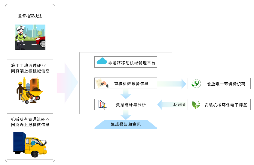 非道路移動(dòng)機(jī)械種類繁多,應(yīng)用廣泛,相對(duì)于機(jī)動(dòng)車而言,存在底數(shù)不清、污染控制技術(shù)水平相對(duì)落后、污染物排放量大等問(wèn)題。因此非道路移動(dòng)機(jī)械監(jiān)管需要通過(guò)機(jī)械信息摸底調(diào)查、環(huán)保編碼上牌及安裝電子標(biāo)簽和在線尾氣傳感器、監(jiān)督抽查執(zhí)法的三步走來(lái)實(shí)現(xiàn)全方位監(jiān)管。