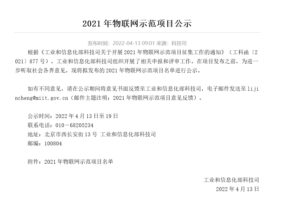 喜報 | 同陽科技強勢入圍工信部2021年度物聯網示范項目名單