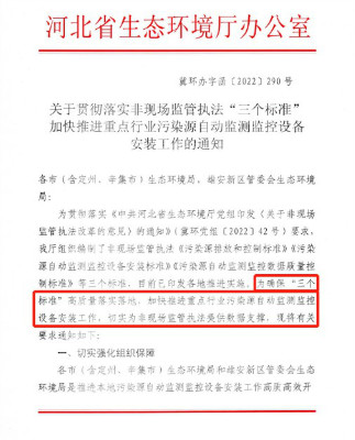為持續(xù)貫徹生態(tài)環(huán)保部的《關(guān)于優(yōu)化生態(tài)環(huán)境保護(hù)執(zhí)法方式提高執(zhí)法效能的指導(dǎo)意見》,2022年,河北省編制了《污染源自動排放和控制標(biāo)準(zhǔn)》《污染源自動監(jiān)測監(jiān)控設(shè)備安裝標(biāo)準(zhǔn)》《污染源自動監(jiān)測監(jiān)控數(shù)據(jù)質(zhì)量控制標(biāo)準(zhǔn)》等三個標(biāo)準(zhǔn),同年7月,河北省生態(tài)環(huán)境廳辦公室印發(fā)《關(guān)于貫徹落實(shí)非現(xiàn)場監(jiān)管執(zhí)法“三個標(biāo)準(zhǔn)”加快推進(jìn)重點(diǎn)行業(yè)污染源自動監(jiān)測監(jiān)控設(shè)備安裝工作的通知》(冀環(huán)辦字函(2022)290號),指出要“加快推進(jìn)重點(diǎn)行業(yè)污染源自動監(jiān)測監(jiān)控設(shè)備安裝工作,切實(shí)為非現(xiàn)場監(jiān)管執(zhí)法提供數(shù)據(jù)支撐”。